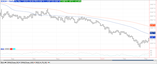 Prices were up $.08 – $.10 today with several contracts closing on their highs.  May-24 jumped to a 3 week high with next resistance at the 50 day MA at $4.51.  No significant change in market fundamentals suggests much of the bearish news may be discounted.  Speculative short covering is perhaps signaling risk/reward is shifting in favor of higher prices.  Little to no change for forecasts in SA as conditions remain mostly favorable. Export sales at 44 mil. bu. were in line with expectations. YTD commitments at 1.544 bil. bu. are up 28% from YA, vs. the USDA forecast up 26%. Census exports in Jan-24 at 169 mil. bu. were down 10.5% from Dec-23 however up 36% from Jan-23.  In the first 5 months of the 23/24 MY corn exports are up 33% from YA and running 97 mil. bu. over the inspection pace. Algeria has reportedly purchased corn from SA origin between $228 – $230/mt CF.  Final volume is unclear however the tender was for 120k mt.  Mexico is reportedly waiting for the US to provide proof that genetically modified corn is safe for humans in the ongoing dispute over their plans to ban the import of GMO corn for human consumption.