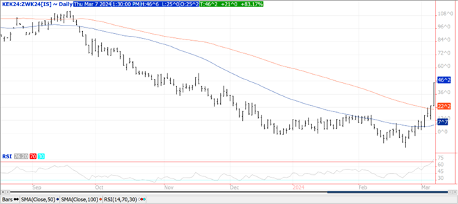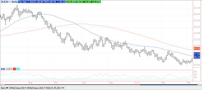 The soybean complex was higher across the board with most contracts closing at or near their highs.  Bean finished up $.12 – $.18, meal was $3 – $4 higher while oil is up 90 – 105.  May-24 beans closed into new highs for the week with not much resistance until $11.92.  Resistance for May-24 meal is at $337.50.  May-24 oil has traded to its highest level in just over 2 weeks with next resistance at its 50 day MA at 47.06.  Spot board crush margins improved $.02 to $.79 ¼ with BO PV closing at 40.9%, the highest since Oct-23. Export sales at 25 mil. bu. were above expectations. Old crop commitments at 1.449 bil. are down 19% from YA, vs. the USDA forecast of down 14%. Census exports in Jan-24 at 219 mil. bu. were up 23.5% from Dec-23 however down 30% from Jan-23. In the first 5 months of the 23/24 MY, exports are down 21% from YA while running 47 mil. bu. over the inspection pace. Meal sales last week at only 158k mt were below expectations. Soybean oil sales at just over 29k mt were above expectations and nearly doubled the YTD commitments as the recent price slump has made BO more competitive in the global vegetable oil market. YTD commitments are now up 3.5% vs. the USDA forecast of down 21%. Chinese imports for Jan/Feb at 13 mmt are down 9% from YA and the lowest since 2019 as crush margins have remained weak on declining hog numbers.  Brazilian exports are starting to accelerate as harvest advances. Feb-24 exports at 6.61 mmt was a record high for the month and up 32% from YA.  Mch-24 exports are expected to nearly double to 12.8 mmt, however still down from 14.4 mmt in Mch-23.