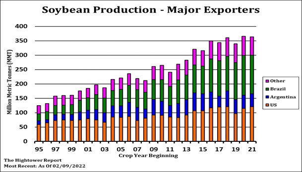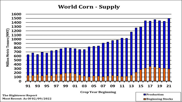 Corn futures ended higher. CK ended near 7.53. Range was 7.28 to 7.60. There may have been some long liquidation before tomorrow’s USDA report. USDA March report tomorrow. Trade estimates US 2021/22 corn carryout at 1,479 mil bu vs USDA 1,540. Most are closer to 1,200 due to higher demand especially exports. Corn followed lower wheat trade today until the Russian rumor reversed trade corn may also be undervalued if US corn export demand increases due to lower South America crop and timing of resumption of Black Sea grain exports. There is talk of heavy Brazil corn sales but some feel the sales could be option origin. US commercials are looking for a big US summer corn export program.