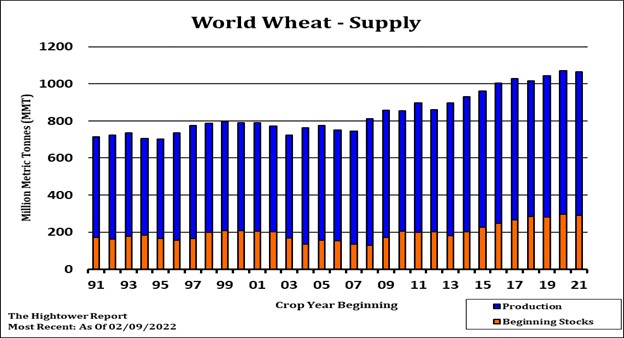 Wheat futures ended lower but off limit down low. Some feel wheat futures were due for a correction given how fast and how high prices have rallied. USDA March report tomorrow. Trade estimates US 2021/22 wheat carryout at 628 mil bu vs USDA 648. Trade estimates World wheat end stocks near 277.6 vs USDA 278.2. USDA announced 193 mt US HRS wheat to Philippines.