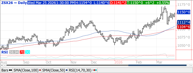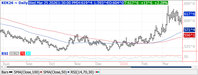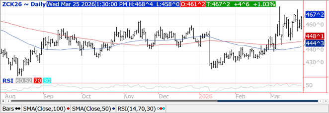 Prices were $.04-$.05 higher closing near session highs. Spreads also firmed. Both May-26 and Dec-26 contracts held support above this week’s low in early weakness. A midday announcement from the EPA issuing a waiver to allow the sale of E-15 during the summer months to help offset higher gasoline prices brought on by the war in Iran provided a boost. I’ve got Mch. 1st stocks pegged at a record 9.074 bil. bu. up from 8.147 bil. YA. USDA Sec. Rollins stated US farmers had secured 80% of their fertilizer needs for 2026 while the remaining 20% aren’t seeing much disruption due to the closure of the Straits of Hormuz. The EPA reported ethanol production rebounded to 328 mil. gallons LW, up from 321 mil. the previous week and up 6% YOY. There was 110 mil. bu. used in the production process, or 15.73 mil. bu. per day, just above the pace needed to reach the USDA forecast of 5.6 bil. Ethanol stocks rose to a 51-week high at 27.2 mil. barrels. Implied gasoline consumption rose 2.2% LW to 8.924 tbd and was up 3.3% YOY. Export sales tomorrow are expected to range between 28-32 mil. bu.