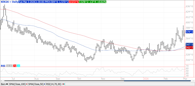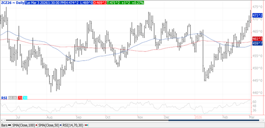 Prices were $.01-$.02 higher with spreads little changed.  May-26 held within yesterday’s range closing just above its 100 day MA at $4.46.  New crop Dec-26 traded to a 9 month high before backing up.  The USDA announced a flash sale of 196k mt (7.8 mil. bu.) to an unknown buyer.  After heavy selling yesterday speculators are pretty much flat in the corn market.   Corn used for the production of ethanol in Jan-26 at only 461 mil. bu. was well below expectations of 483 mil.  The data suggests sorghum usage as a feedstock continues to grow at the expense of corn.  In the first 5 months of the 25/26 MY corn usage is down .5% from YA vs. the USDA forecast of up 3%.  The USDA corn usage est. is starting to look too high.  Tomorrow’s EIA report is expected to show ethanol production range between 326-338 mil. gallons, vs. 329 mil. the previous week.  As of Mch 1st EU corn imports for the 25/26 MY at 11.74 mmt are down 21% YOY.  US FOB offers at the Gulf remain $.10-$.20 bu. above Argentine offers into the summer months.