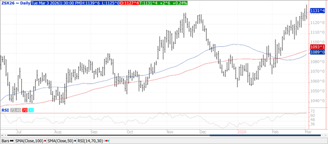Prices were steady to higher across the complex.  Soybeans ranged from $.03-$.06 higher, meal was up $1-$2 while oil was steady to 10 higher.  Bean and oil spreads were mixed while meal spreads firmed.  May-26 beans have held within yesterday’s range.  May-26 meal has 100 day MA support at $310.80.  May-26 oil filled yesterday’s gap before recovering.  Nov-26 traded to its highest level since May-24.  Prices couldn’t hold overnight strength, nor the midday weakness closing at about midrange.  Early gains were driven by a surge to new highs in energy markets and news that US/China trade negotiators will meet in Mid-March in Paris.  While this meeting may still pave the way for a Trump/Xi summit in Beijing starting late this month, it appears the prospects of additional Chinese purchases of US soybeans is becoming less likely.  Spot FOB offers at the US Gulf are now $1.30 bu. above Brazil.  While that difference slips to only $.85 bu. by June, it’s still difficult to envision additional Chinese purchases under those pricing dynamics.  Production est. in Brazil have trended lower with too wet of conditions in the north while dry in the south.  Recent forecasts have come in just below the USDA’s 180 mmt.  Census crush in Jan-26 at 227.8 mil. bu. was slightly above expectations.  YTD crush is up 7.4% from YA vs. the USDA forecast of up 5.1%.  Crush Feb-26 thru Aug-26 will need to reach 1.451 bil. bu. vs. 1.402 bil. YA.  The Ave. daily crush rate has leveled off near 7.4 mil. bu. day since peaking just above 7.6 mil. in Oct-25.  Bean oil stocks rose 11.7% to 2.433 bil. lbs., slightly above expectations and the highest since April-23.  EU soybean imports as of Mch. 1st at 8.3 mmt are down 10.4% YOY.  Meal imports at 12.2 mmt are down 6%.