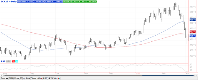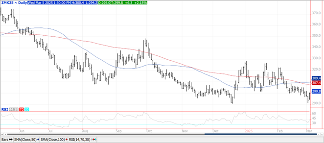 Prices were higher across the complex with beans up $.06-$.13 led by old crop, meal surged $5-$7 while oil was up 15-20 points. Spreads across the complex are firmer. For now May-25 has rejected trade below $10 while ending a run of 5 consecutive lower closes. Next major resistance is the 100 day MA at $10.29 ½. Spot FOB prices between US and Brazilian soybeans continues to narrow, down to $.45 for April offers, well off the $1.00+ per bu. in late Jan-25. Healthy rains will continue to impact central and southern Argentina thru Saturday before a much needed drying pattern for week 2 of the outlook. Some rains will likely shift into NE Argentina by early next week bringing only modest relief from heat/drought stress. Dryness in EC and NE growing areas of Brazil is forecast to continue for another week with improved prospects for rain in week 2. A good mix of rain and sunshine for southern and WC growing areas of Brazil. After today’s Celeres lowered their Brazilian bean production forecast 2.4 mmt to 171.6 mmt, still just above the Feb USDA est. of 169 mmt. May-25 oil plunged to a 2 month low however held just above the $.42 level before recovering. Bean oil ended a run of 8 consecutive lower closes. Early pressure was likely being felt from sharply lower energy prices. After holding support just above the contract low yesterday, May-25 meal recovered back to the $300 level. Spot board crush margins rebounded $.03 ½ to $1.13 ½ bu. with bean oil PV slipping to 42%. The CME Group has announced they will launch a soybean oil share contract that pending regulatory approval will start trading as early as Mch 31st. The Chinese Govt. raised their budget for grain and vegoil stockpiling by 6%. Tomorrow’s export sales are expected to range from 12-20 mil. bu. for soybeans, 150-400k tons of meal and 20-45k tons of oil.