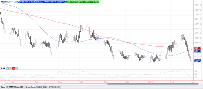 Futures held gains of $.08-$.12 into the close across all 3 classes, however remained within yesterday’s range. The higher closes ended 7 consecutive lower closes in CGO and KC, and 10 consecutive lower closes for May-25 MGEX. New contracts lows were scored across all 3 classes yesterday. Next major support for spot CGO futures is $4.93 ½, the low from last Aug-24 on the weekly bar chart. The Aug-24 low for spot KC is $5.12 and $5.37 ½ for spot MGEX. A major winter storm continues to pull across the nation’s midsection bringing heavy rains to the central Midwest yesterday. Snow on the back end of the system brought some heavy accumulations in central IA and SE MN. As the system pulls east over the next 24-36 hours, rain may turn to snow with sharply cooler temperatures and extremely high winds. The northern plains remain in a net drying pattern. Russia’s Ag. Ministry indicates they plan on expanding 2025 crop area to 84 mil. hectares, up 1 mil. from YA. They went on to report 55.8 mil. hectares have already been planted with winter crops adding that 87% of these areas were in good or satisfactory condition. The recent speculative selling in CGO futures has likely driven the speculative short position back out to 95k contracts, up from only 61k 2 weeks ago. Export sales are expected to range from 8-16 mil. bu.