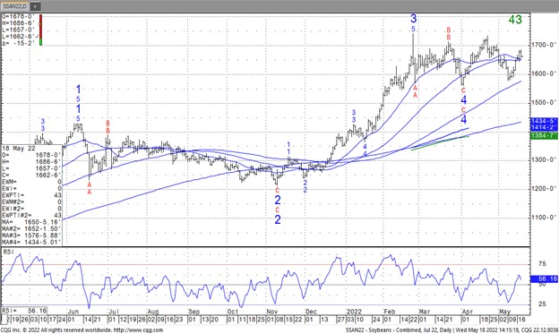 Soybeans ended lower. Some feel 17.00 SN may be too high for now and may be rationing demand. Still in August US crush and soybean demand could be near record high which could send prices back over resistance. USDA announced US old crop and new crops soybean sales to unknown. Weekly old crop soybean sales is est near 150-500 mt and new crop 50-600.