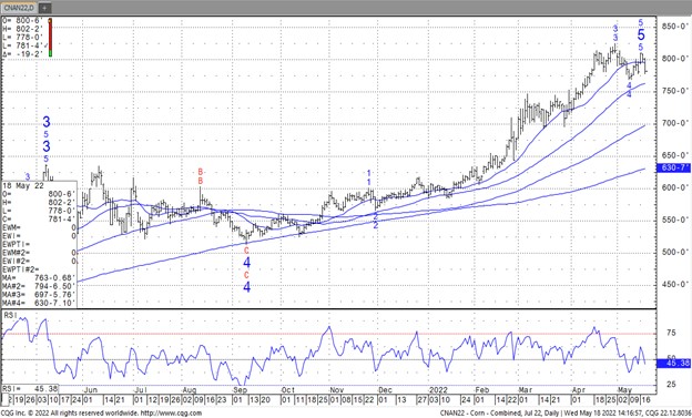 More talk of US recession and slower World economies have triggered selling in most commodities. On days like this, the glass is half full. Unexpected steep decline in top US retail companies earnings raised concern about consumer demand. Consumers are being hit by higher energy and food prices. Retail companies said cost of moving product to shelves were a lot higher than expected. This is not expected to change anytime soon. Corn futures ended lower. Some feel 8.00 CN may be too high for now and may be rationing demand. Still in Q4 demand could be near record high which could send prices back over resistance. Weekly US ethanol production was near last week and down 4 pct from ly. Stocks were down 1 pct from last week but still up 22 pct from ly. Weekly old crop corn sales is est near 150-450 mt and new crop 500-900. There were rumors that Russia may allow a corridor of Ukraine grain to leave Odessa if NATO members allow Russia Fertilizer exports. Most doubt this and suggest buying this break.