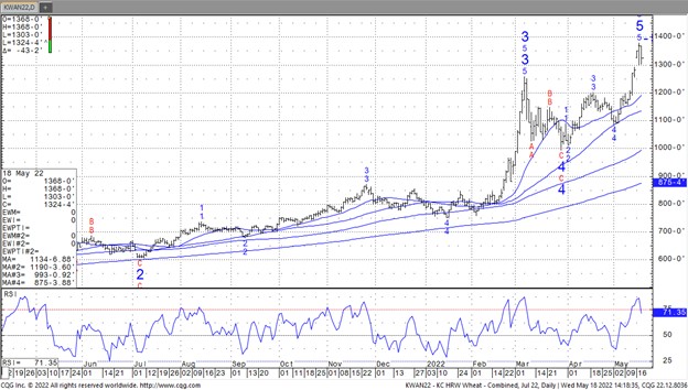 Wheat futures ended sharply lower. There were rumors that Russia may allow a corridor of Ukraine grain to leave Odessa if NATO members allow Russia fertilizer exports. Some feel 13.00 WN and 14.00 KWN may be too high for now and may be rationing demand. Still, USDA is estimating World exporters stocks to use ratio record low with demand uncovered and supply tightening. Weekly old crop wheat sales is est near -50-150 mt and new crop 50-250. So far, Annual US HRW crop tour has found 40 mil bu crop in CO vs 69 ly, 37 in NE vs 41 ly, 60 in OK vs 115 ly and 41 in TX vs 74 ly. USDA est KS crop near 271 vs 364 ly. 5 state total 449 vs 663 ly.