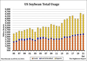 July corn managed small gains on a late rally. Early on, Managed funds were net sellers of 10,000 contract. At the end of the day they were net buyers of 2,000. Most of the recent fund selling was due to the recent private guess of US 2021 corn acres near 96 million versus USDA 91. This has trump talk of higher China buying US corn and lower Brazil crop. Today, USDA announced another 1.36 mmt of US 2021/22 corn sold to China. This could bring sales to 9-10 mmt. Some still feel China could take 40 mmt all origin corn in 2021/22 versus 30 this year. Trade also could see final Brazil corn crop below 90 mmt. This could add 325 mil bu to US 2021/22 corn export. Near the highs, Trade was talking a US 2021/22 corn carryout near 1,200 versus USDA 1,502. Informa 96 million acres suggest a carryout near 1,900. Today one group estimated Brazil corn crop near 91 mmt vs USDA 102. Weekly US ethanol production was up 5 pct from last year and 55 pct from last year. Stocks were up slightly from last week but down 17 pct from last year. Margins improved. Crushers continue to bid up for corn and most look for higher domestic summer fuel demand. Weekly US old crop corn sales are est near -300-400 mt vs -113 last week. New crop is est near 3,000 to 4,500 mt versus 2,083 last week.