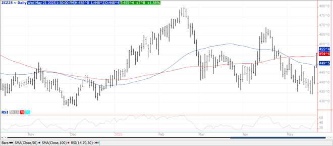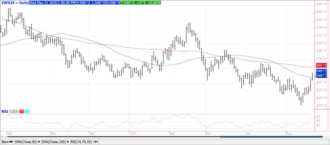 Prices were up another $.06 ½ – $.07 ½ today as spreads are mixed. Fresh 2 week high for July-25 while a 3 week high for Dec-25. Next resistance for July-25 is the 50 day MA at $4.68 ¼. Dec-25 has pushed thru its 100 day MA. I’m sensing US weather is no longer being viewed as bearish. Seasonally cool and dreary conditions across much of the N. Midwest and Great Lakes region for another 24-48 hours. AgroConsult’s is forecasting record production for Brazil’s 2nd corn crop at 112.9 mmt, well above Conab’s May forecast at only 97.9 mmt. SovEcon is forecasting Russian grain production will reach 127.6 mmt in 2025, up from 125.9 mmt YA. Ethanol production rebounded to 305 mil. gallons LW, up from 292 mil. the previous week and up 1.7% YOY.