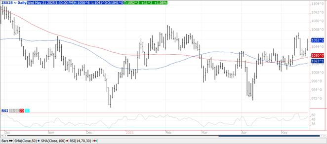 Prices were up another $.06 ½ – $.07 ½ today as spreads are mixed. Fresh 2 week high for July-25 while a 3 week high for Dec-25. Next resistance for July-25 is the 50 day MA at $4.68 ¼. Dec-25 has pushed thru its 100 day MA. AgroConsult’s is forecasting record production for Brazil’s 2nd corn crop at 112.9 mmt, well above Conab’s May forecast at only 97.9 mmt. SovEcon is forecasting Russian grain production will reach 127.6 mmt in 2025, up from 125.9 mmt YA. Ethanol production rebounded to 305 mil. gallons LW, up from 292 mil. the previous week and up 1.7% YOY.