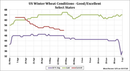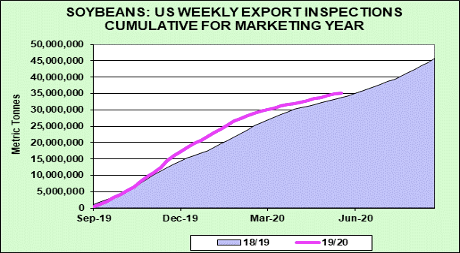 Wheat futures took a back seat to higher US equity and lower US Dollar trade. Higher financial markets and new US soybean sales to China and soymeal sales to the unknown sparked new buying in soybeans. Corn followed. Chicago wheat is still traded lower. KC and Minn managed some gains. Bears still feel that cash sales should be made closer to 5.30 WN. Rains fell across most of US Midwest and east section of south plains. West HRW missed the rains. Some feel final US 2020 wheat crop will be down from USDA May guess but not enough to push prices higher. There were rains in parts of east Europe and west Russia. West and North Europe forecast looks dry. Weekly US wheat exports were near 16.8 mil bu versus 19.5 last year. Season to date exports are near 896.1 mil bu versus 889.2 last year. USDA goal is 970 versus 936 last year. Concern about lower World trade demand and USDA May estimate of record World 2020/21 wheat end stocks continues to offer resistance to prices. Key could be Russia supplies and their exports and export pace.