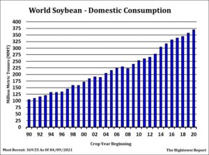 Soybeans traded higher. SN is near 15.69. SX is near 14.09. Talk of higher demand for US soybean crush and higher World vegoil prices helped push prices higher. New money continues to pour into the market on concern about US summer weather. USDA May supply and demand report is approaching. Trade looks for US 2020/21 soybean carryout to be near 118 mil bu vs USDA 120. Trade also est Argentina Soybean crop near 46.9 mmt vs USDA 47.5 and Brazil 136 vs USDA 136. Trade estimates US 2021 soybean crop near 4,431 mil bu vs 4.135 last year. This could be below forecasted demand especially if US crush increase due to increase soyoil demand. China came back from holiday and oilseed futures were sharply higher. Dalian soybeans were up 90 cents and near 25.45. Soyoil futures made new highs. EU rapeoil futures are trading near 75 cents versus 65 last week. Weekly US old crop soybean sales were near 165 mt vs 292 last week. Total commit is near 61.2 mmt vs 39.5 last year. USDA goal is 62.0 mmt vs 45.7 ly. China shipments are near 35.0 mmt with total commit at 35.7 mmt.