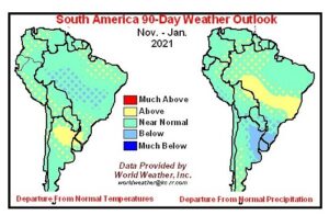 Wheat futures trade lower led by KC. Weather forecast calls for rains across the US south plains. GFS model has good rains and coverage. EU model has less rains but a little more than yesterday. Rains may not help wheat stands buy will add moisture for the spring. Over the last few days some of the dry areas of Russia also saw good rains. Key will be if the rains continue across the Black Sea. Russia domestic wheat buyers are asking the government for new wheat export quotas to help the domestic preserve supplies. Weekly US wheat export sales were near 192 mt. This was below expectations and last week. Total commit is near 17.2 mmt versus 15.6 last year. USDA US wheat export goal is 26.5 mmt versus 26.2 last year. Wheat futures may be in a range depending upon 2021 World weather. Managed funds were net sellers of 4,000 wheat. We estimate Managed Money net long 19,000 contracts of SRW wheat. WZ support is near session low and 5.89. Resistance is 6.04.