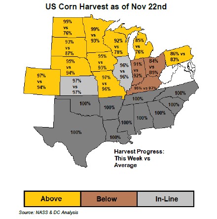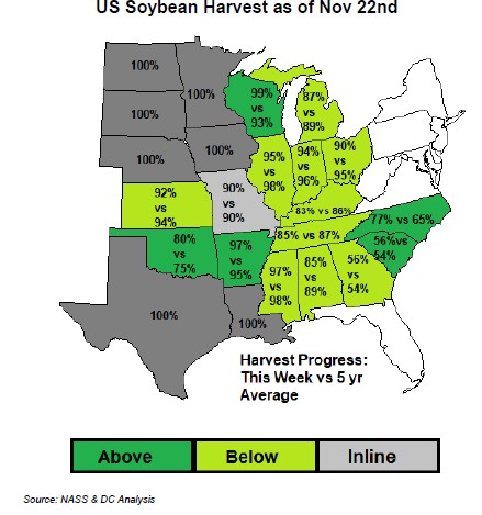 Corn futures ended marginally higher. Managed funds continue to be net buyers of corn futures. Some feel they could add to positions on talk of lower US 2022 supply and tight World 2021 supplies. Domestic US corn basis is firm as US harvest ends and ethanol margins remain positive. Weekly ethanol production should be near last week with a small drop in stocks. Some feel US corn demand for ethanol could be up 100 mil bu from USDA guess. US corn exports remain below early estimates. Most analyst estimate US 2021/22 corn carryout near 1,290 mil bu vs USDA 1,493. Matif corn futures made new highs on tight EU corn supplies. China continues to be an active importer of feedgrains. Now a net buyer of Australia feed wheat. Bulls need a South America weather problem to push above resistance. Increase Argentina and Ukraine corn supply and exports limits the upside in futures for now. US corn exports are near 229 mil bi or down 18 pct from last year. Fact US and EU wheat futures continue to trend higher offers support to corn.