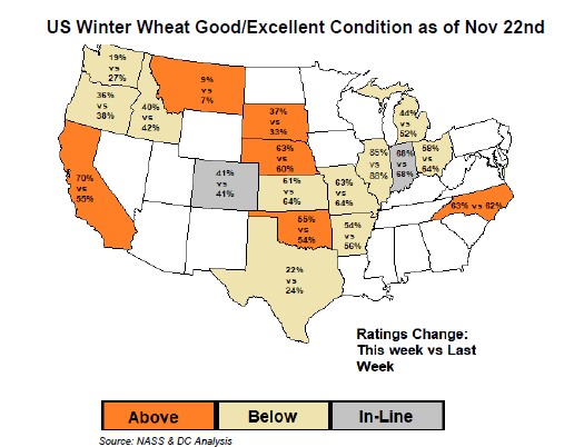 Wheat futures ended higher. Talk of higher EU and Black Sea futures offered support. Fact World wheat import demand could increase from USDA last guess and crop could drop from USDA estimate supports World prices. East Australia rains has pushed Australia milling quality wheat fob prices higher. Record low World exporters stocks to use ratio and higher Russia prices is also supportive. Jan Russia wheat prices is up to $373 and implies export tax near $120. Either World wheat prices will need to rally to slow demand or higher Russia wheat prices could increase US exports. USDA dropped US 2022 winter wheat crop rating to 44 Pct G/E vs 46 last week. OK 55 vs 54, KS 61 vs 64, TX 22 vs 24, NE 63 vs 60, IL 85 vs 88, OH 58 vs 64, OR 36 vs 38 and WA 19 vs 27.