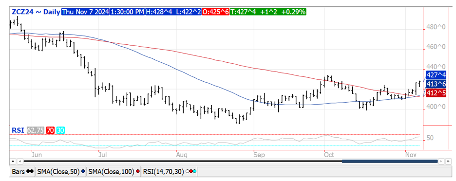 Prices recovered late to close $.01-$.02 higher in choppy 2 sided trade. Spreads were slightly lower with today being the first day of the Goldman roll. Dec-24 traded to its highest level in a month with next resistance at the early October high at $4.34 ¼. With yesterday’s speculative traders reporting buying nearly 20k contracts of corn flipping the money manager position to net long for the first time in 15 months. Exports at 112 mil. bu. (109 mil. – 24/25 MY, 3 – 25/26) were above expectations. YTD commitments at 1.040 bil. are up 48% from YA, vs. the USDA forecast of up 1.4%. Current commitments represent 48% of the USDA forecast, above the historical average of 41%. Shipments are up 32%. Noted buyers last week were Mexico 55 mil. old crop and 3 mil. 25/26, unknown – 27 mil. and Japan – 12 mil. In addition, the USDA announced a fresh sale of 120k mt (4.7 mil. bu.) to an unknown buyer. Commitments to Mexico at just over 470 mil. bu. are a record high for the end of Oct. Commitments to unknown at just over 250 mil. bu. are at the highest level in at least a decade. There has been some speculation China may have also been boosting US corn imports ahead of the potential for Trump tariffs.