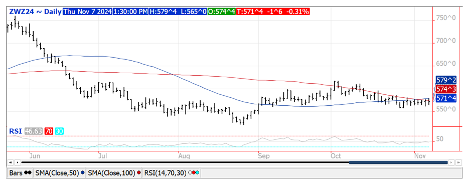 Prices were $.02-$.05 lower across all 3 classes today and continue to be the weakling of the Ag. space. Chicago Dec-24 failed to break out of 2 week range of roughly $5.60-$5.80 stalling at its 50 day MA. Similar story for KC Dec-24. Dec-24 MGEX remains stuck between $5.95-$6.20. The US Southern plains are forecast to receive another 1-3” of rainfall thru this weekend, helping further ease drought stress. Russia’s Prime Minister stated their country has harvested 128 mmt of grain so far in 2024 without stating what percentage of the crop had been harvested. Just yesterday their Ag. Minister felt their total grain harvest would be only 130 mmt, down from earlier projections of 150 mmt. The Ag. Minister is forecasting wheat production at 83 mmt, a touch above the current USDA forecast of 82 mmt. Exports at 14 mil. bu. were in line with expectations and bring YTD sales to 510 mil. up 18% from YA, vs. the USDA forecast of up 17%. Commitments represent 62% of the USDA forecast, slightly below the historical average of 63%.