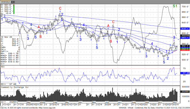 WH is near 5.51. KWH is near 5.41. MWZ is near 5.84. WH has been in a technical uptrend sine Oct low near 5.08 to recent high near 5.68 on increase volume but sharp drop in open interest. For the most part wheat futures have been a follower to higher soybean futures and rumors China was a buyer of US wheat. Argentina and Russia wheat export prices are now below US. Trade est US wheat carryout at 867 mil bu vs 844 in Sep. A bigger number could be World ending wheat stocks est at 266.1 mmt vs 264.0 in Sep and one est near 270.0.