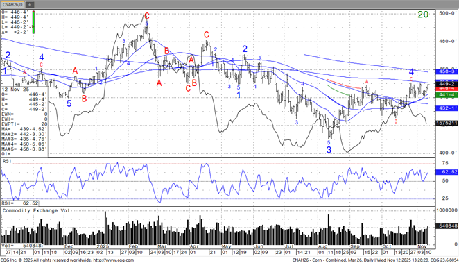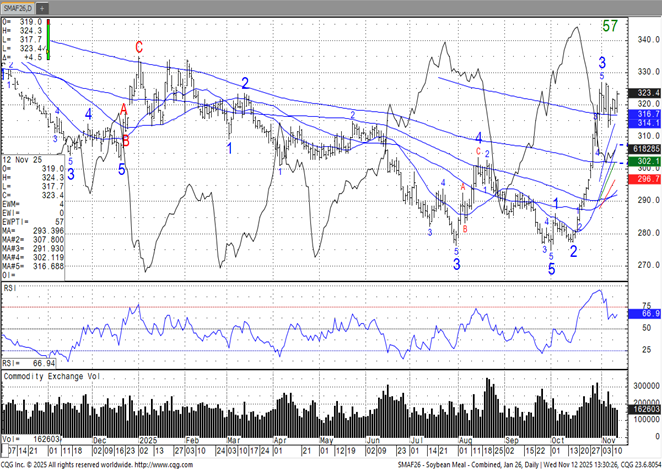 SF is near 11.28. Trade awaits Fridays USDA report. Trade estimates US soybean crop at 4,266 mil bu vs USDA Sep est of 4.301. The big number could be US 25/26 soybean carryout. Trade est carryout at 304 mil bu vs 300 in Sep but range is 187 to 494. Key could be if WOB shows higher exports due to China deal or not. SF has been in technical rally since October low near 10.70 to recent high near 11.33. We estimate that Managed funds have bought 80,000 soybean contracts are now long 100,000. They also covered some of their soymeal short and are long soyoil. Some will begin to watch dryness across C Brazil but rains are forecasted there next week.