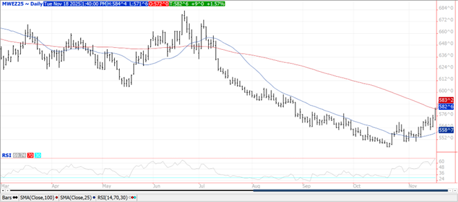 Prices ranged from $.02 lower in spot KC to $.09 higher in spot MIAX. Spreads firmed in CGO and MIAX while weaker in KC. Dec-25 MIAX has traded to a fresh 2 ½ month high while closing at its 100 day MA resistance. No confirmation of US sales to China after rumors of their interest surfaced yesterday. Jordan reported bought 60k mt of wheat in their recent 120k mt tender. No prices details yet available. US winter wheat plantings have reached 92%, just below the YA pace and 5-year Ave. of 94% and 95% respectively. Winter wheat ratings at only 45% G/E are well below analysts’ expectations during the Govt. shutdown and below the 49% from YA. EU 25/26 soft wheat exports as of Nov. 16th at 9.05 mmt are slightly below YA at 9.09 mmt. The 8.6% YOY increase in production from S. Hemisphere exporters will limit US export opportunities.