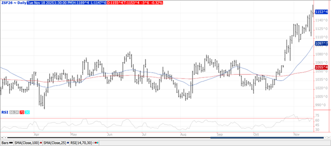 Prices were sharply mixed across the complex with beans $.02-$.04 lower, meal was off $3-$4 per ton while oil was up a full penny. Bean and meal spreads weakened while oil spreads firmed. Overnight strength in Jan-26 beans enabled prices to work into a gap on the chart from the spring of 2024. It would take a move up to $11.90 to fill this gap. Dec-25 oil jumped out to a 2 month high while pretty much closing right at its 100 day MA. Inside trade for Dec-25 meal as it held support near the old resistance near $325. Classic case of “buy the rumor, sell the fact” trade in soybeans today after the USDA confirmed a large 792k mt Chinese purchase of US soybeans. US soybean harvest at 95% as of Sunday compares to 98% YA and the 5-year Ave. of 96%. NE is only 84% harvested vs. 100% Ave. while KS is 91% vs. Ave. of 94%. Known bean sales to China sit at around 1.1 – 1.2 mmt, with a couple hundred thousand tons of additional sales to unknown. Some estimate recent sales may ultimately reach 2 mmt or more. Further sales (or lack thereof) will continue to drive price volatility. EU soybean imports as of Nov. 16th at 4.4 mmt are down 16% YOY while meal imports at 6.74 mmt are down 8.5%. Yesterday’s massive NOPA crush figure from Oct-25 would suggest the current USDA crush est. for 2025/26 MY at 2.555 bil. bu. is too low. Look for a 25-50 mil. bu. increase in the Dec-25 WASDE update. The US balance sheet is looking tighter nearly every day. ABIOVE lowered their 25/26 Brazilian production est. .8 mmt to 177.7 mmt, still just above the USDA forecast of 175 mmt. ABIOVE is forecasting Brazil’s crush at 60.5 mmt and exports at 111 mmt vs. the USDA est. of 59 mmt and 112.5 mmt respectively. Question becomes how much over Brazil soybeans will China be willing to pay for US beans, which will go a long way at determining how high prices can go with currently no major weather threat in SA.
