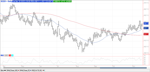 Prices were $.01-$.02 higher in 2 sided trade. Spreads also firmed. Dec-25 pushed above yesterday’s high with next resistance at LW’s high of $4.42 ¾. The Dec/July spread at one point narrowed to $.24 ¼, the highest in 7 months. Updated harvest progress showed only 91% of the US crop has been harvested as of Sunday the 16th, below the 98% pace from YA and the 5-year Ave. of 94%. Delays are most prominent in the WCB with NE at only 74% vs. 5-year Ave. of 95%, KS at 92% vs. 97% Ave., and SD at 90% vs. 94% Ave. With rains in NE limited to the far southern region should enable good harvest progress this week. Chinese corn imports in Oct-25 at 430k mt were up 43% YOY, however YTD imports at only 1.29 mmt are off 90%. EU 25/26 corn imports as of Nov. 16th at 6.02 mmt are down 23% YOY. Corn will likely be a follower of what soybeans do as US stocks are plentiful at over 2.15 bil. bu. with a record export forecast to live up to and a seemingly optimistic feed usage estimate at 6.1 bil. bu.