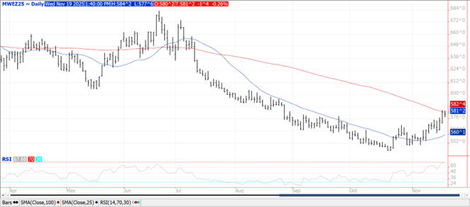 Prices ranged from $.02 lower in MIAX futures to $.11 lower in KC. Despite the weakness spreads were steady to firmer. Inside trade for Dec-25 MIAX as it held close to its 100 day MA. Dec-25 KC closed near its 50 day MA support at $5.15. Census wheat exports in Aug-25 at 99 mil. bu. were up 10% YOY and the highest for the month in 9 years. June thru August exports (Q1 25/26 MY) at 248 mil. are a 5 year high and up 14% YOY. Ukraine’s Economic Minister has suggested his country will not restrict wheat exports for the balance of the 25/26 MY. They estimate 25/26 production at 23 mmt, matching the USDA however forecast exports at 17 mmt, above the USDA est. at 15 mmt. To date their exports at only 6.8 mmt are off 21% from YA. Export sales for the week ended Nov. 13th are expected to range between 12-22 mil. bu.