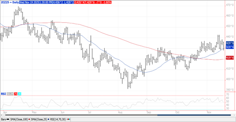 Prices were $.06-$.08 lower today while spreads were mixed. Dec-25 traded to a new low for the week while closing at its 50 day MA. Next support is at the 100 day MA at $4.19 ¾. The USDA reported the delayed census export data from Aug-25 which was originally scheduled for release Oct. 7th. Corn exports at 252 mil. bu. were up 24% from YA and a record high for the month. EIA data show ethanol production increased to 1,091 tbd, or 321 mil. gallons in the week ended Fri. Nov. 14th, up from 316 mil. the previous week however down 1.7% from YA. There was 109 mil. bu. of corn used in the production process, or 15.53 mil. bu. per day, just above the 15.36 mbd needed to reach the USDA corn usage estimate of 5.60 bil. bu. Ethanol stocks inched up to 22.3 mil. barrels, in line with expectations while below YA at 22.6 mb. Implied gasoline usage last fell 5.5% to 8.528 tbd, however was up 1.3% YOY. Tomorrow’s export sales report will cover the week ended Oct. 2nd. Traders expect sales for the week ended Nov. 13th to range between 55-95 mil. bu. This sales data will be released on Dec. 11th.