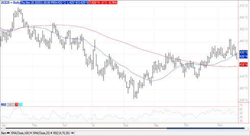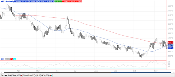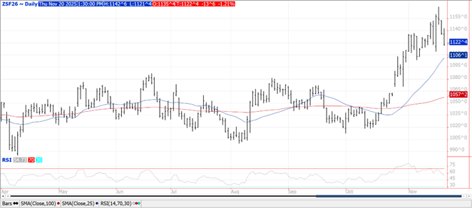 Prices were moderately lower across the complex with several contracts closing near session lows. Beans were down $.09-$.14, meal was off $3-$5 while oil was down 45 points. Bean and meal spreads weakened while oil spreads were flat. Jan-26 beans finished $.47 off this week’s 17 month high. Support is at this week’s low of $11.14 ¼. Support for Dec-25 meal is at the 50 day MA at $310.90. Support for Dec-25 oil also at the 50 day MA at 50.39. The USDA announced another flash sale of 462k mt (17 mil. bu.) to China bringing this week’s total to 1.584 mmt and just over 1.8 mmt this month, 15% of the 12 mmt the Trump Admin. claims China has agreed to purchase for the 2025/26 MY. Chinese customs data showed that of their record Oct-25 soybean imports of 9.5 mmt, none had come from the US for a 2nd consecutive month. 7.1 mmt were from Brazil with 1.6 coming from Argentina. Thru the first 10 months of 2025 total Chinese imports sit at 95.7 mmt with 71 mmt coming from Brazil while only 16.8 from the US. These totals will begin to start shifting back to the US a bit. As of Sept. 30th MM’s were net short 39k contracts of soybeans, nearly 118k meal and just over 1k oil. At present we feel the position in soybeans has flipped to net long 100k contracts, still short 70k contracts of meal and long 14k bean oil. Soybean sales for the week ended Oct. 2nd at 34 mil. bu. brought YTD commitments to 470 mil. bu. down 36% from YA. The current USDA forecast at 1.635 bil. bu. is down 13% from YA. Still no commitments to China as of that week’s data. How much US soybeans China is willing to buy over cheaper offers from Brazil will go a long way in determining if we have seen prices peak. While US beans remains competitive with Brazil in the spot FOB market, Brazil’s discount to US by Feb-26 has stretched out to nearly $1 bu.