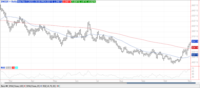 Prices were mixed today with CGO and KC $.04-$.05 higher while MIAX was off $.01. The Dec-25 contracts for both CGO and KC traded to fresh 3 month highs while also closing at session highs. The 100 day MA for both now serves as support after being overhead resistance for months. Dec-25 MIAX did hold 50 day MA support at $5.54 ¼. Speculative buying continues to fuel recent gains. Yesterday’s reported purchase of US SRW wheat by China brings their total purchases in the past week to nearly 500k mt. Perhaps weighing on prices in early trade were reports Russia’s Grain Union is considering doubling their grain export quota for the 2nd half of the 25/26 MY to 20 mmt, vs. only 10.6 mmt YA.
