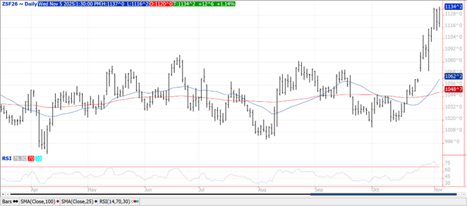 Prices were $.04-$.05 higher with spot Dec-25 posting its highest close in 4 months. Prices did however hold below last week’s low at $4.37. Chart support rests at the 100 day MA near $4.20. Spreads weakened. Ethanol production surged to a record high 1,123 tbd, or 330 mil. gallons in the week ended Fri. Oct. 31st, up from 321 mil. the previous week and up 1.6% from YA. Production was well above expectations. There was 112 mil. bu. of corn used in the production process, or 16 mil. bu. per day, well above the 15.36 mbd needed to reach the USDA corn usage estimate of 5.60 bil. bu. In the MY to date there has been 930 mil. bu. used, or 15.25 mbd, an annualized pace of 5.57 bil. Ethanol stocks rose to 22.7 mil. barrels, slightly above expectations while above YA at 22.0 mb. No USDA export sales tomorrow however traders est. sales last week to have ranged from 35-80 mil. bu. Sales should be holding up well as US FOB offers remain $5-$10 per ton below Brazil out to Feb-26.