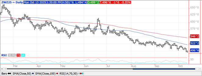 Prices were steady to $.02 lower across the 3 classes. Early weakness saw new contract lows for Dec-25 in both CGO and KC. Dec-25 CGO matched the weekly low from Aug-25. Dec-25 KC traded to a 5 year low on the spot weekly, undercutting the Sept-25 low by a quarter cent. IKAR reported Russia’s wheat export prices ended last week at $229/mt, down $3 from the previous week. They also forecast exports in Oct-25 will exceed 4.5 mmt. APK Inform raised Ukraine’s wheat production forecast .5 mmt to 22.4 mmt, vs. the USDA est. of 23 mmt. Saudi Arabia indicates they have purchased 500k mt of wheat from Saudi investors that have grain trading operations in foreign countries. No terms were disclosed other than shipment is expected before April-26.
