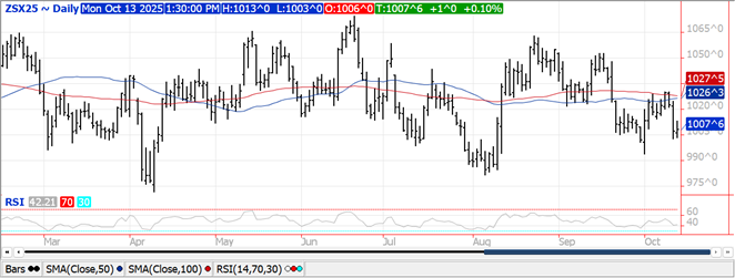 The soy complex was quietly mixed as beans were up $.01-$.02 ½, meal was down $1 while oil was 60-65 higher. Bean spreads weakened while product spreads were steady to firm. Inside trade for Nov-25 beans as it has held above Friday’s low of $10.02 ½. Next support for Dec-25 meal is the October low at $270.10. Inside trade for Dec-25 oil with next resistance at the 50 day MA at 51.83. US Treasury Sec. Bessent this AM suggested Pres. Trump’s meeting with Pres. Xi later this month is on after substantial talks with Chinese trade officials this weekend while also maintaining the US threat of 100% tariffs on Chinese imports starting Nov. 1st “does not have to happen.” Spot board crush margins recovered $.04 to $1.52 bu. with bean oil PV recovering to 48%. Chinese soybean imports from all sources in Sept-25 at 12.869 mmt, were up 4.8% from Aug-25 and up 13% from Sept-24. This was a record high for the month and 2nd highest ever, coming in below the May-25 total of 13.9 mmt. YTD imports have reached 86.2 mmt, up 5.3% from YA. US bean harvest likely reached 58% as of Sunday, just above the 5-year Ave. of 57%, however below YA pace of 64%. Brazilian soybean plantings advanced 5% this week to 14% complete, well above the 8% pace from YA. Plantings in Mato Grosso, their top producing state, have reached 21% vs. the 5-year Ave. of 17%. Conab is out tomorrow with updated production estimates in Brazil. US NOPA crush is on Wednesday.