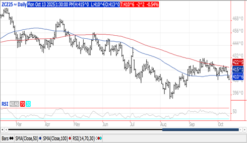 Prices were $.01-$.02 lower, unable to hold the bounce overnight. Spreads weakened, also not able to hold early strength. Dec-25 held support at the October low at $4.10 ½. Early strength was capped right at the 50 day MA at $4.15. Meanwhile US harvest rolls. Rains this week are expected to be lite while favoring the WCB. The ECB to remain mostly dry until next weekend. US corn harvest has reached 45% thru this weekend, equaling YA and ahead of the 5-year Ave. of 42%. APK Inform raised Ukraine’s grain harvest .3 mmt to 59.1 mmt, however lowered their corn production est. .5 mmt to 30.3 mmt. Their corn export forecast is at 24.5 mmt. This compares to the USDA production forecast at 32 mmt and export at 25.5.