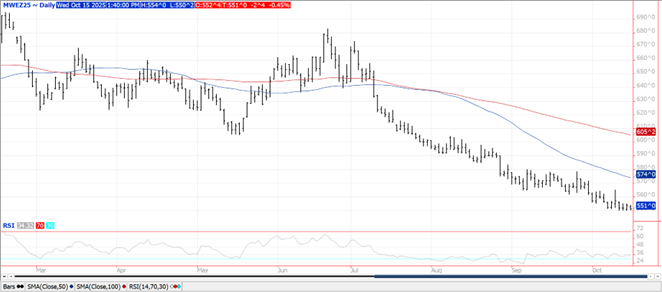 Prices were steady to $.03 lower today, failing to build on yesterday’s key reversal trade in KC futures. Support rests at yesterday’s contract lows across all 3 classes. Dec-25 MIAX futures have held support at its contract low at $5.50 the previous 3 sessions with today’s low ¼ cent above it. A group of S. Korean flour mills bought 50k mt of US wheat in a snap tender. France’s AgriMer left their 25/26 wheat export forecast outside of the EU steady at 7.85 mmt, however raised their forecast for exports within the EU 4.5% to 7.04 mmt. Russian announced they have resumed exports to Indonesia this month after a 9 month pause. Indonesia renewed quarantine certificates in August to allow the shipment of 52k mt this month. Russia sold 1.3 mmt of wheat to Indonesia in 2024, vs. only 123k tons earlier this year. Still lacking a spark to ignite a meaningful short covering rally.