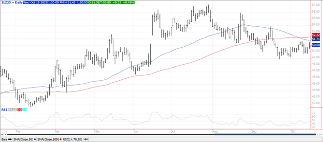 Prices held on to slight gains into today’s close with beans steady to $.01 higher, meal was up $1-$2 while oil was 25 points higher. Bean and oil spreads were steady to lower while meal spreads firmed. Nov-25 beans continue to hold support above $10 however were not able to push above this week’s high. Outside day up for Dec-25 meal with next resistance at the Oct-25 high at $282. The gap higher open in Dec-25 oil overnight failed to hold. Resistance just above today’s high is at the October high at 51.60. I’m not sure how much leverage the Trump Admin. thought they’d get from playing the UCO card. US imports of UCO from China have already plummeted this year with tariffs on Chinese imports and given that under the Big Beautiful Bill, tax credits only apply toward biofuels produced from domestically sourced feedstocks. Jan-Aug UCO import volume at only 291k tons is down 65% YOY. Last year we imported a record 1.27 mmt of UCO from China valued at $1.1 bil. while China imported just over 22 mmt of US soybeans valued at $12 bil. Bottom line, don’t expect China to suddenly turn to the US for bean imports if we threaten to no longer import their UCO, something we’ve already nearly eliminated. In July-25 (last monthly data available) soybean oil accounted for 37% of the feedstock used in the production of biofuels while UCO had slipped to only 14%, down from a peak of 25% in April-23. NOPA crush at 197.86 mil. bu. was a record high for the month, and well above the expected range. Usage was also up 4.2% from the 189.8 mil. processed in Aug-25, despite 1 less day. Bean oil stocks at 1.243 bil. lbs. were down slightly from the 1.245 bil. at the end of Aug-25 however slightly above expectations.