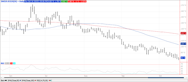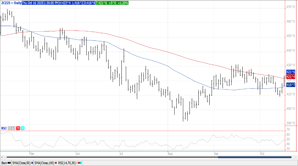 Prices were higher across the complex with bean up $.04 closing well off session highs, meal was up $1 while oil sold off late closing up only 10 points. Bean and meal spreads firmed while oil spreads weakened. Nov-25 beans jumped out to new highs for the week with next resistance resting between $10.26-$10.27 ½. Dec-25 meal recovered late on spreading as oil pulled back. Dec-25 oil rejected trade above its 50 day MA. Spot board crush margins slipped $.01 ½ to $1.58 bu. with bean oil PV holding steady at 47.9%. A slight easing of trade tensions with China enabled agricultural prices to work higher. A spokeswoman from China’s commerce ministry today clarified their recent rare earth restrictions do not amount to an outright ban and that exports will continue “as long as the rare earths are used for civil purposes.” While weekend rains will slow the remaining harvest in the central and ECB, it will help ease drought conditions. Yesterday’s record high NOPA crush for Sept. at 198 mil. bu. provided underlying support. Oil stocks at 1.243 bil. lbs. while slightly above expectations, would imply stronger usage. Also supporting the soy complex was a report from Reuters that suggests China has slowed soybean purchases for Dec/Jan citing higher premiums in Brazil. The report also suggests the Chinese Govt. may use state reserves to supply end users if purchases are delayed further. Their Dec/Jan needs are est. to be roughly 8-9 mmt. Bulls might argue that China may also be waiting to see how talks between Pres. Trump and Xi go if they do meet later this month in S. Korea. After buying around 4k contracts yesterday we have speculative traders pretty much flat in soybeans, essentially a risk off approach building up to the potential Trump/Xi meeting. The EPA reported D4 biodiesel blending credits generated in Sept-25 at 660 mil. were up 21% from the previous month, and the highest since Dec-24.