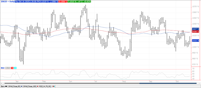 Prices were $.03-$.05 higher carving out a 3rd consecutive higher close. Spreads also firmed. Dec-25 closed above its 100 day MA resistance however held below the October high at $4.24 ½. Ethanol production ticked up to 316 mil. gallons LW, in line with expectations and up 3% YOY. There was 107 mil. bu. of corn used in the production process, or 15.3 mil. bu. per day, just below the 15.4 mbd needed to reach the USDA corn usage estimate of 5.60 bil. bu. Ethanol stocks slipped to 22.6 mil. barrels, in line with expectations and above YA at 22.3 mb. Implied gasoline usage fell 5.2% to 8.455 tbd and was down 2% YOY. Yields have varied greatly, particularly in areas most impacted by disease. History would suggest the USDA yield est. at 186.7 bpa is too high. Since 1990 the USDA has raised yields in Aug. only to lower them in Sept. (like this year) 8 times. In 5 of those years final yields were below the Sept forecast by an average of 5.3 bpa. The 3 years final yields were higher was by an average of less than 1 bpa.