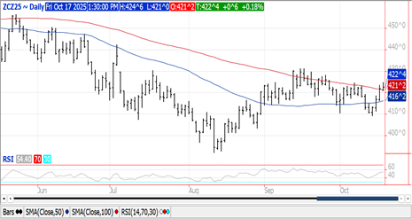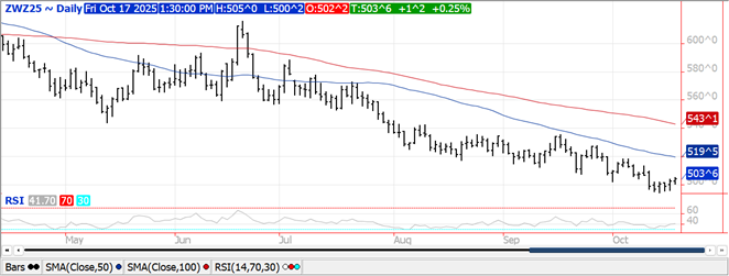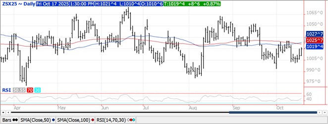 Prices were higher across the complex with bean up $.07-$.09, meal was $3-$4 higher while oil was up 25 points in choppy 2 sided trade. Spreads also strengthened across the complex. Nov-25 beans traded to a new high for the week in late trade. Next resistance at the 100 day MA at $10.26. Dec-25 meal stretched out to a 2 week high with resistance at $282. Yesterday Dec-25 oil rejected trade into new highs for the month, setting up the overnight weakness. Spot board crush margins jumped $.04 to $1.62 bu. finishing at a 5 week high. Bean oil PV slipped back to 47.7%. Prices drew support from Washington as the Trump Admin. continues to work at easing trade tensions with China. This afternoon the President stated he felt the US is in a strong position to discuss trade with China and confident a deal will be made that is good for both sides. Yesterday the EPA reported D4 biodiesel blending credits generated in Sept-25 at 660 mil., up 21% from August and the highest since Dec-24 suggesting a big rebound in renewable diesel production during the month. Bulls remain hopeful US can still participate in bean sales into China ahead of SA harvest early next year. At stake is roughly 8-10 mmt, or 290-365 mil. bu. for the Dec/Jan period. US farmers are storing all they can of this year’s harvest awaiting the outcome of Trump/Xi talks while also patiently waiting to see what the Trump Admin. financial aid package will look like. Also early next month the Supreme Court will take up arguments over whether the Trump Admin. use of tariffs were indeed legal, something the lower appellate court deemed were not. With usage and production data lacking due to Fed. Govt. shutdown, markets likely to be driven by social media posts and yield reports the 2nd half of Oct.
