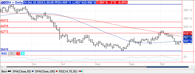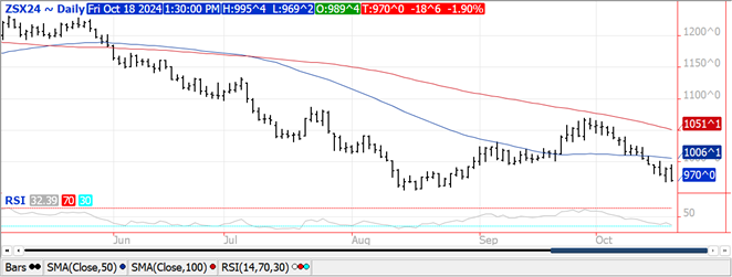 Prices were lower across the complex with beans down $.10-$.16, meal was $1-$2 lower, while oil was off 50-70. Support for Nov-24 beans is at the contract low of $9.55 with resistance at the 50 day MA $10.06 ¼. After an early price surge thru its 50 day MA, Dec-24 meal settled back to slightly lower levels. Dec-24 oil also traded thru its 100 day MA resistance at 42.73 before pulling back below 42.00. Global weather continues to shift more favorable with both Brazil and Argentina expecting a good mix of rain and sunshine over the next few weeks, beneficial to planting and crop development. Much of the Central US will remain dry over the next 5-7 days enabling harvest to continue to move along quickly. Spot board crush margins firmed another $.05 to $1.84 ½ bu. closing at a 3 month high with bean oil PV holding just under 40%. Export sales at 63 mil. bu. were in line with expectations and bring YTD commitments to 803 mil. up 5% from YA vs. the USDA forecast of up 9%. China/unknown combined to buy 33 mil. bu. bringing combined commitments to 532 mil. bu. below the 567 mil. from YA and well below the 810 mil. bu. from 2022. In addition, the USDA announced the sale of 293k mt (10.7 mil. bu.) to an unknown buyer. Soybean meal sales at 251k tons were in line with expectations. YTD commitments are up 3% from YA, vs. the USDA forecast of up 9%. Soybean oil sales were less than 1k tons however the USDA announced the sale of 21k tons to Mexico. Safras & Mercado raised their Brazilian bean export forecast for 2025 10 mmt to 107 mmt vs. the USDA forecast for 24/25 MY at 105 mmt. Safras also raised their crush forecast to 55.5 mmt, vs. the USDA est. of 54 mmt.