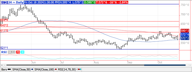 Prices plunged in response to Russia’s lofty goals seeking greater control in global wheat trade. Chicago was the downside leader off $.15-$.18 with KC and MGEX down $.10-$.14. Dec-24 for all 3 classes traded above their respective 100 day MA resistance levels before pulling back. While rain is still expected this weekend in the US Southern plains, overall coverage and totals will likely not be as widespread as earlier forecasts. Exports at 18.5 mil. bu. were at the high end of expectations and bring YTD sales to 461 mil. up 17% from YA, matching the USDA forecast. YTD by class commitments are: HRW +55% vs. USDA +64%, SRW -24% vs. -27%, HRS +14% vs. +13% and white +41% vs. +28%. The USDA’s ending stock estimate for Russia is at a 9 year low. Russia’s Ag. Ministry lowered their wheat export tax 5.5% to 2,672 roubles/mt for the period ending Oct. 29th.