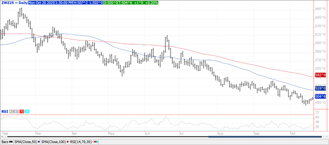Prices ranged from $.02 lower to $.01 higher, unable to hold higher trade overnight. Dec-25 MIAX matched its contract low of $5.48 for a 3rd consecutive session. Export inspections at 18 mil. bu. were in line with expectations and above the 15 mil. bu. needed per week to reach the USDA forecast. YTD inspections at 411 mil. bu. up 20% from YA, vs. the USDA forecast of up 9%. An Australian grain analyst raised their wheat production .5 mmt to 35.7 mmt vs. the USDA forecast of 34.5 mmt. IKAR is reporting the export price for Russian wheat ended last week at $231 mt, up $2 from the previous week. SovEcon raised their export forecast for Oct. ever so slightly to 5.1 mmt. Algeria is seeking 50k mt of soft milling wheat in a tender that expires Wed. Oct. 22nd. Ukraine’s 25/26 wheat shipments as of Oct. 20th at 5.68 mmt are down 22.6% from YA. US winter wheat plantings are expected to have reached 75%, up from LW’s est. of 66%.