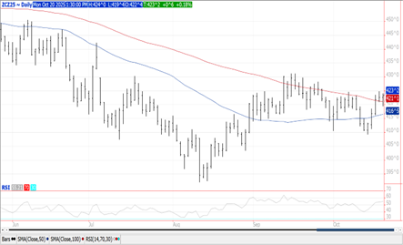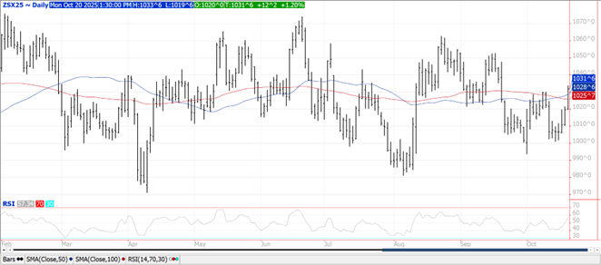 Prices were higher across the complex with beans up $.11-$.13, meal was $4-$5 higher while oil was up 20-25 points. Bean spreads were mixed while product spreads weakened. Nov-25 beans closed at its highest level in a month and above both its 50 and 100 day MA’s. Next resistance is the September high at $10.53. Dec-25 meal also surged to a 1 month high closing above its 50 day MA. Next resistance is at the 100 MA at $287.70. Dec-25 oil held below its 50 day MA resistance at 51.58. Spot board crush margins slipped $.02 to $1.60 bu. with bean oil PV falling to 47.4%. Pres. Trump stated he thinks US/China can still work out a trade deal that is beneficial to both sides while encouraging China to return to buying the same volume of US soybeans. Trump still plans on meeting with Chinese leader Xi in less than 2 weeks in S. Korea while Treasury Sec. Bessent is set to meet with Chinese Vice Premier in Malaysia this week. Bean inspections at 54 mil. bu. were above expectations and a MY high. They were also well above the 33 mil. needed per week to reach the USDA forecast. YTD inspections at 204 mil. bu. are down 31% from YA vs. the USDA forecast of down 10%. Numerous countries took between 5-8 mil. bu. US demand to non-Chinese buyers remains strong. AgRural is reporting Brazil’s soybean crop is 24% planted vs. 18% YA. China imported 12.9 mmt of soybeans in Sept., the 2nd highest total ever, however none came from the US. This is the first time Chinese imports from the US fell to zero since Nov-18 during the 1st US/China trade war in Trumps 1st term. The market remains hopeful the US can pick up at least some of the 300-350 mil. bu. of expected Chinese imports for the Dec/Jan timeframe ahead of Brazil’s soybean harvest early next year.
