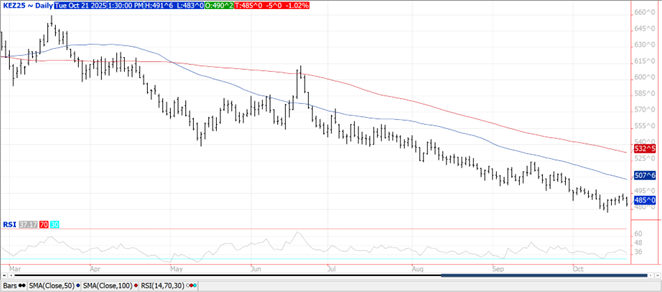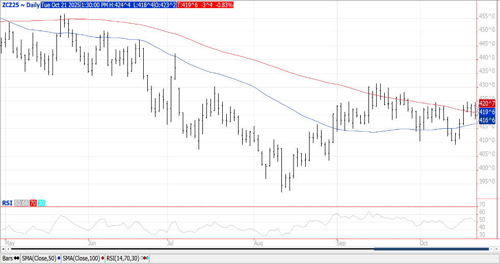 Prices fell $.03-$.04 today while spread finished mixed.  Dec-25 slipped back below the 100 day MA as well as yesterday’s low.  Next support is at the 50 day MA at $4.16 ¾.  A Reuters poll indicates traders and analysts feel US corn harvest has reached 59%, below the YA pace of 62% however ahead of the 5-year Ave. of 57%.  IMO prices have also been negatively impacted by increased tensions with Colombia.  This past weekend the Trump Admin. ended all US aid to the SA country with Pres. Trump calling Colombian Pres. Petro an “illegal drug dealer” for doing nothing to stop drug production in his country.  Colombia has been our 3rd largest importer of corn in recent years, taking just over 300 mil. bu. in 2024/25, just over 10% of our total corn exports.  The API reversing their decision to no longer support the year round sale of E-15 in the US isn’t helping.  DataGro is forecasting ethanol produced from corn in Brazil will increase 3-3.5 bil. gallons in 2026/27 MY, up from 9.9 bil. in 2025/26 which increased from 8.25 bil. in 2024/25.  EU 2025/26 corn imports as of Oct. 19th at 4.61 mmt are down 26.6% YOY.  Tomorrow’s EIA report is expected to show US ethanol production between 306-321 mil. gallons last week vs. 316 mil. the previous week.