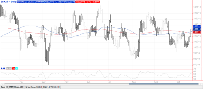 Prices were mixed across the complex with bean down $.01-$.02, meal was steady to $2 higher while oil slipped 55-65 points.  Bean and meal spreads firmed while oil spreads are slightly lower.  Nov-25 beans stalled out after reaching a new high for the month.  Support is at the 100 day MA at $10.25 ¾.  Dec-25 meal also jumped out to a 1 month high stalling just below its 100 day MA at $287.40.  Dec-25 oil failed to challenge its 50 day MA resistance at 51.54.  Spot board crush margins slipped another $.02 to $1.57 ½ bu. with bean oil PV falling to a 4 month low at 46.9%.  Recent strength in the soybean market may also be an injection of weather premium.  Weekend rains across WC and northern growing areas of Brazil were fairly widespread, however according to World Weather, not as heavy as hoped.  This area is forecast to hold in a dryer than normal pattern thru month end.  While this may promote active plantings in the short term, much more rain is needed to promote crop development.  US Soybean harvest likely to have reached 73%, ahead of the 5-year Ave. of 72% however below last year’s record pace of 79%.  EU 25/26 soybean imports at 3.51 mmt are down 6.5% YOY.  Meal imports at 5.41 mmt are down 1%.  Markets remain hopeful that a US/China trade deal will enable the US to compete for roughly 300-350 mil. bu. of Chinese demand in the Dec/Jan timeframe ahead of Brazil’s new crop harvest early next year.  After yesterday trade we estimate MM’s are short around 110k contracts of meal while long 15k soybean and 10k oil.  Despite agribusiness bankruptcies on the rise in Brazil, soybean acres continue to grow, expanding their global production dominance.
