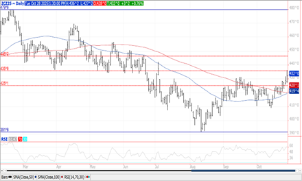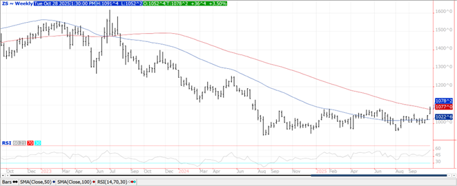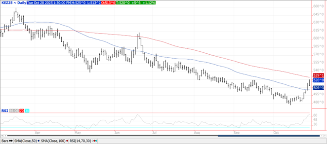 Prices ranged from steady to $.03 higher as spreads also recovered. Dec-25 futures jumped out to a 4 ½ month high while closing a chart gap from July 4th weekend. December also tested resistance at the 50% retracement from the Feb-25 high to the Aug-25 low at $4.35 ¾. A Reuters survey estimates US harvest has reached 73%, below the YA pace of 81%. A S. Korean feed group reportedly bought 204k mt of feed corn from either US, SA or South Africa for Feb-26 shipment. EU 2025/26 corn imports as of Oct. 26th at 5 mmt are down 27% from YA. Tomorrow’s EIA report is expected to show ethanol production range from 320-330 mil. gallons last week, vs. 327 mil. the previous week. While the Nov-25 USDA and WASDE reports look less likely every day.