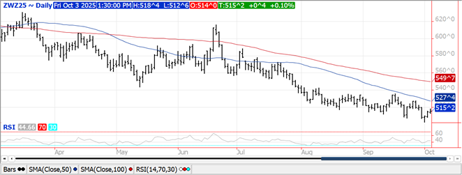 Prices were steady to $.02 lower across the 3 classes today.  Dec-25 CGO was able to scratch out a 3rd consecutive higher close, up $.00 ½, however nowhere else.  The Taiwan Flour Milling Group reportedly purchased just over 80k mt of US milling wheat for late Nov. thru Dec-25 shipment.  The purchase included durum, HRW and soft white.  Russia has reportedly shipped only 5.7 mmt of grain in Sept-25, down 28% YOY.  Of that 5.1 mmt was wheat.  To help stimulate sales the Russia’s Ag. Ministry lowered their export tax 20% to 493.4 roubles/mt for the period ending Oct. 14th.  The BAGE reports 93% of the Argentine crop is in G/E condition, up from 89% LW.  They recently raised their production forecast to 22 mmt, well above the USDA est. of 19.5.
