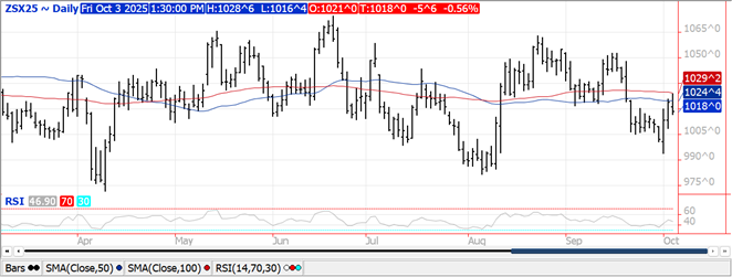 Prices finished lower across the complex with beans $.04-$.06 lower, meal was down less than a $1 while oil was 10-15 points lower.  Spreads also weakened.  Late hedge pressure from weekend harvest likely factored in while the market may have also tapped all the support it could from Pres. Trump’s China/soybean social media posts from earlier this week.  A WSJ report late yesterday stated the Trump Admin. is developing an aid package for American farmers in the $10-$14 bil. dollar range using tariff revenue to fund much of the financial assistance.  US harvest should continue to roll nearly uninterrupted thru the weekend before scattered showers begin to fill in early next week.  Temperatures to remain in a much above normal pattern thru mid-Oct.  Deliveries against Oct-25 meal jumped to 244 contracts while oil fell to 276.  Early strength saw Nov-25 beans trade to a fresh 2 week however also stalled just below its 100 day MA at $10.29 ¼.  Fresh 2 week high for Dec-25 meal before pulling back.  Dec-25 oil spent the latter half of the week consolidating near $.50 lb.  Spot board crush margins held steady at $1.45 ½ bu. with bean oil PV slipping to 47.3%.    Yesterday speculative traders bought 10k contracts of beans, 5,500 meal, while selling a couple thousand oil.  That’s 40k contracts of soybeans the past 2 sessions, pretty much wiping out what was a modest short position.  Either the speculative community feels the odds of a trade agreement with China is increasing, or yields are not holding up as harvest rolls, or just given the uncertainty of it all, they just wanted out.  Probably a little bit of both, however O.I. yesterday did climb nearly 3k contracts in beans.  S&P Global lowered their soybean yield to 53 bpa down from 53.8 with production at 4.261 bil. 40 mil. bu. below the USDA.  The Linn Group is forecasting US bean production at 4.185 bil. bu., 116 mil. below the USDA, with an average yield of 52.1 bpa.