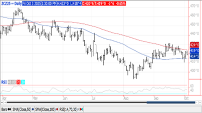 Prices were $.02-$.03 lower following a late selloff.  Spreads were mixed and little changed.  Dec-25 corn traded to a new high for the week however stalled just below its 100 day MA at $4.24.  Speculative traders bought 10k contracts yesterday cutting their short position back to 100k.  Open interest however rose nearly 12k contracts, an indication of fresh $$$ coming in on the long side of the market, not just a short covering rebound.  Yesterday S&P Global lowered their US corn production forecast to 16.707 bil. bu. 107 mil. below the USDA est. in Sept-25.  They knocked their Ave. corn yield down nearly 4 bpa to 185.5 vs. the USDA est. of 186.7.  Today the Linn Group estimated US corn production at 16.635 bil. bu. with an average yield of 184.7 bpa.  Argentina plantings are moving quickly according to the BAGE at 20%, up from 12% LW.  A leading Ukrainian farm group raised their corn production forecast 3 mmt to 29 mmt, still below the USDA forecast of 32 mmt.  The UN’s food and agricultural organization’s World Food Price Index slipped to 128.8 in Sept. down from 129.7 in August.  Lower costs for dairy, vegetable oils, sugar and cereals more than offset higher meat costs.